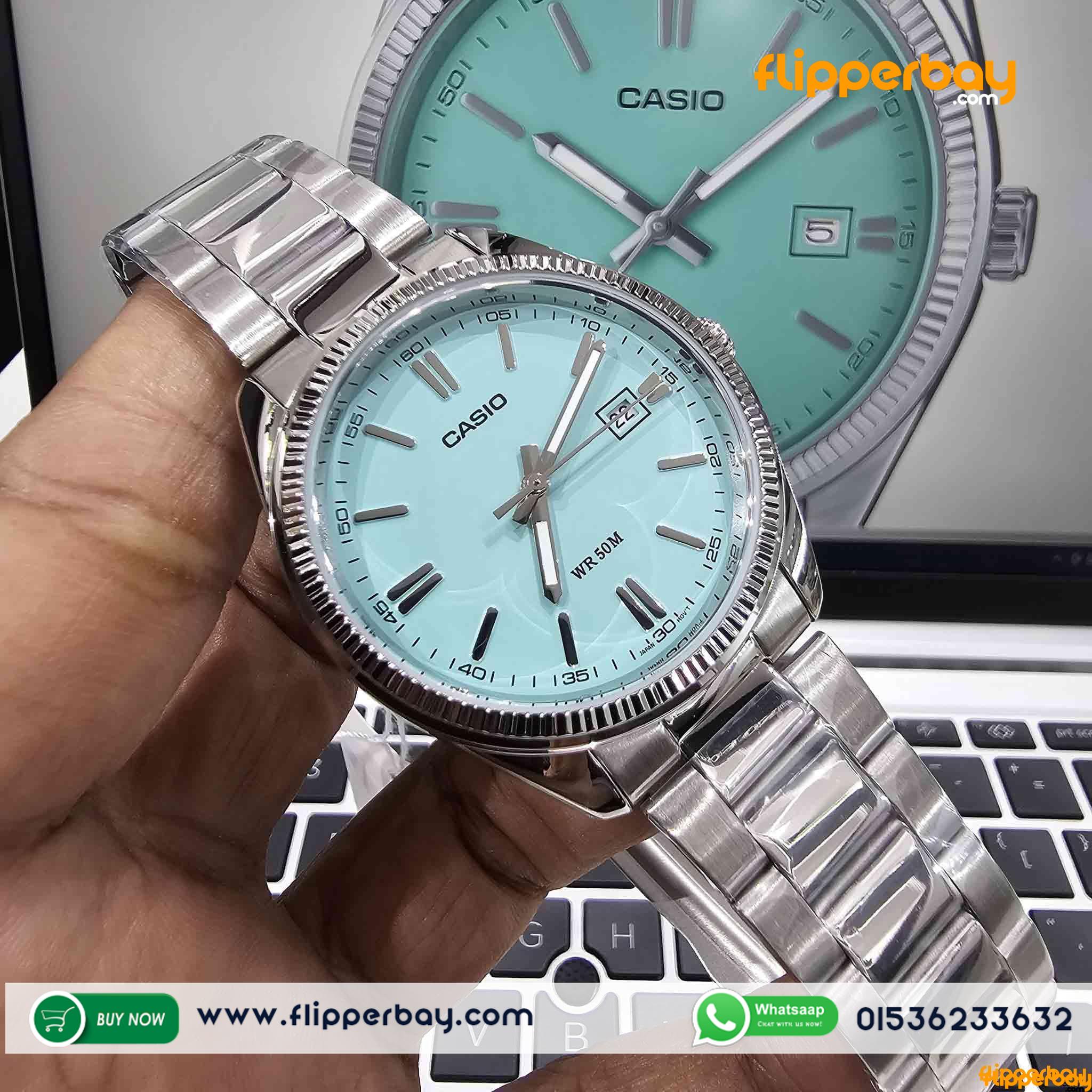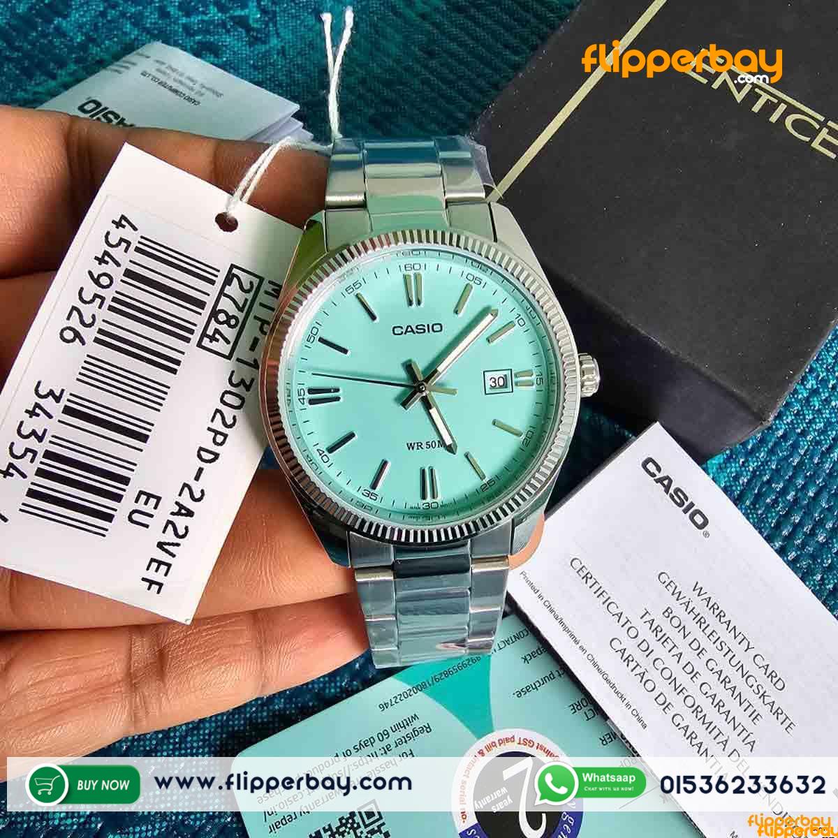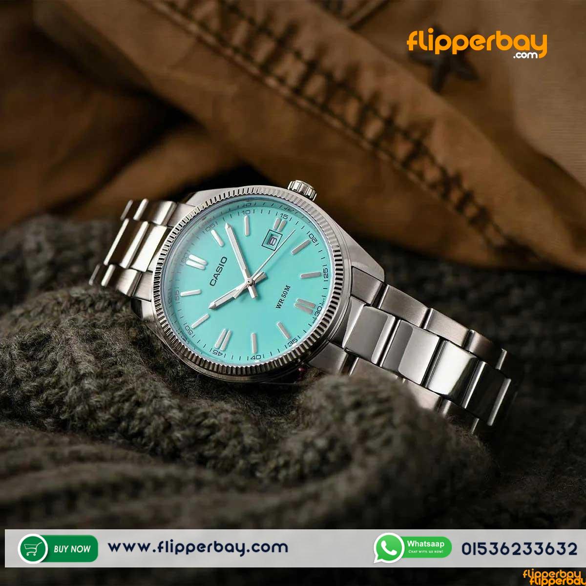Elevate your style game with the MTP-1302D-2A2V. This timeless simple silver watch features a stunning turquoise blue dial that is complemented by luminous hands and markers, providing easy readability in low-light conditions. It is designed with a sleek stainless steel case and band, making it both sophisticated and durable.