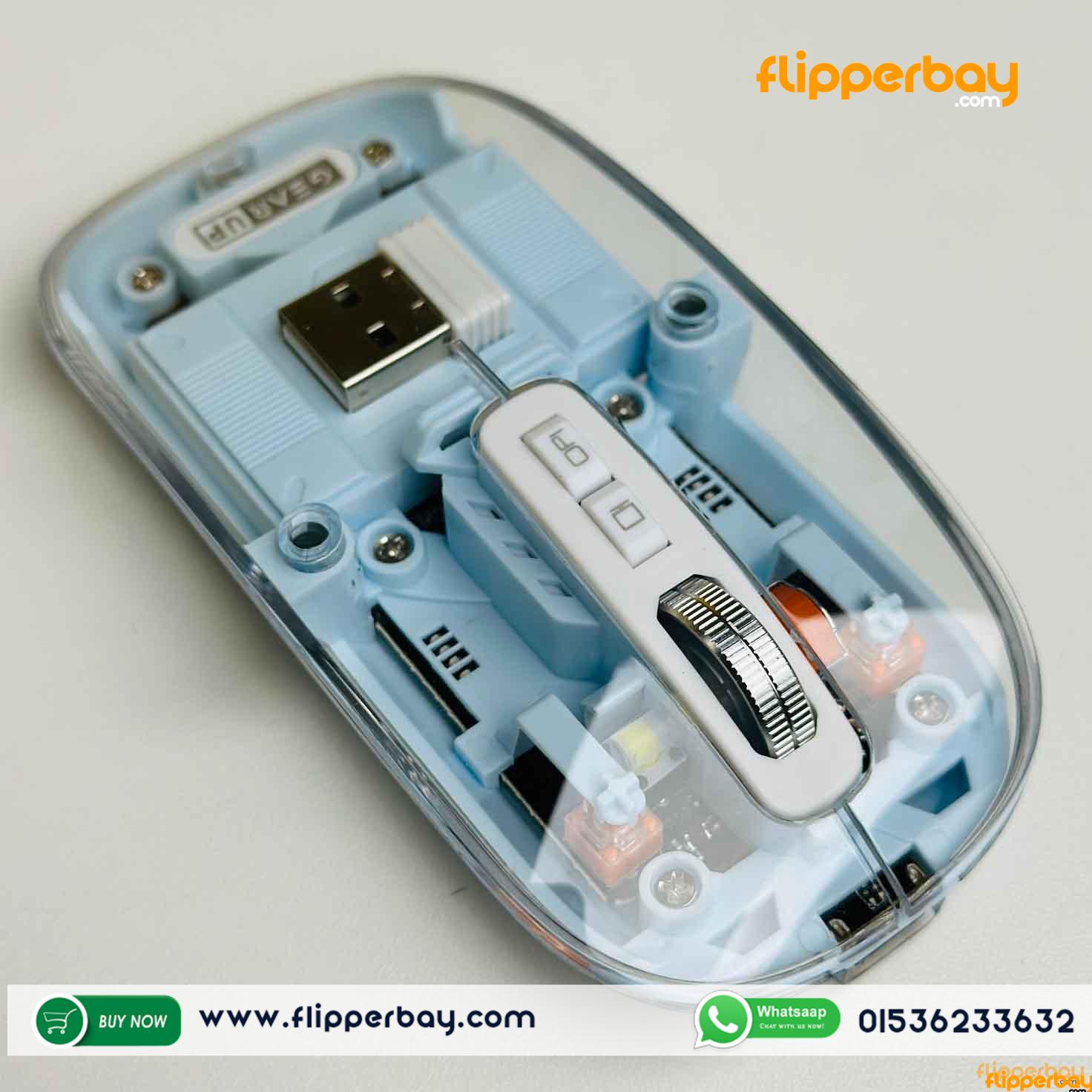 The GearUP WM30 Transparent Wireless Mouse is a stylish and functional mouse perfect for home and office use. It features a transparent body that allows you to see the inner workings of the mouse, as well as a comfortable ergonomic design that will help to reduce fatigue during long periods of use. The mouse also supports both 2.4GHz wireless and Bluetooth connectivity, so you can connect it to up to 3 devices at the same time.