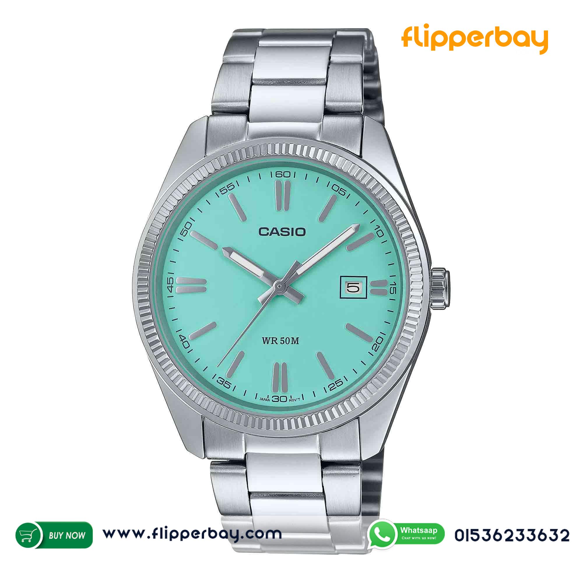 Elevate your style game with the MTP-1302D-2A2V. This timeless simple silver watch features a stunning turquoise blue dial that is complemented by luminous hands and markers, providing easy readability in low-light conditions. It is designed with a sleek stainless steel case and band, making it both sophisticated and durable.